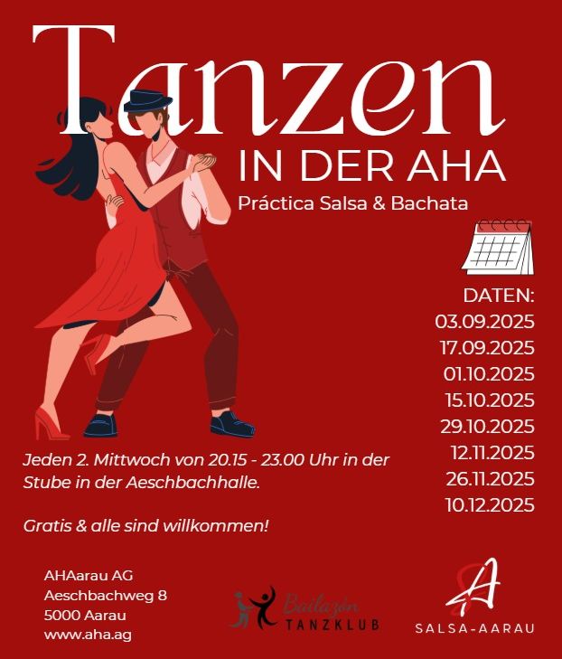Ab 2025 findet ca. alle 2 Wochen, immer mittwochs von 20:15 bis 23:00 Uhr, Tanzen in der AHA (Práctica) im Raum Stube statt. 💃🏼🕺🏼Der Sinn dahinter: Tanzen, Figuren üben und dabei Spass haben! 😍 Es wird Salsa- und Bachata-Musik laufen 🎶 und einen Kühlschrank mit Getränken gibt es auch.🚰🥂🍺🍸Das Práctica ist kostenlos und für alle zugänglich – auch für diejenigen, die nicht Schüler der von Salsa-Aarau sind.😊