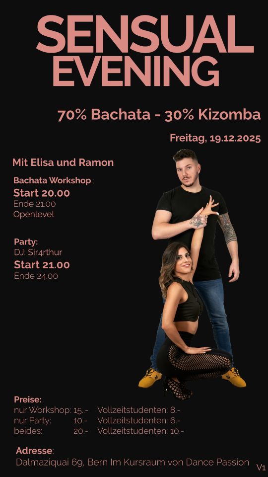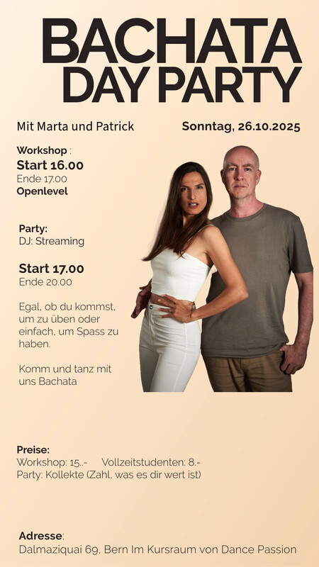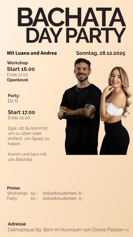 Bei Bachata Day Party Bern ist der Name Programm, es finden regelmässig coole Bachata Partys jeweils sonntagnachmittags statt 💃🏻🕺🏻 Familiär in entspannter Atmosphäre, siehe Flyer.
